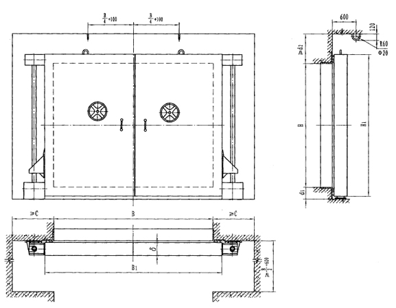 | 型號(hào) | 門(mén)孔寬B | 門(mén)孔高H | 門(mén)扇厚δ | B1 | H1 | C | D1 | D2 |