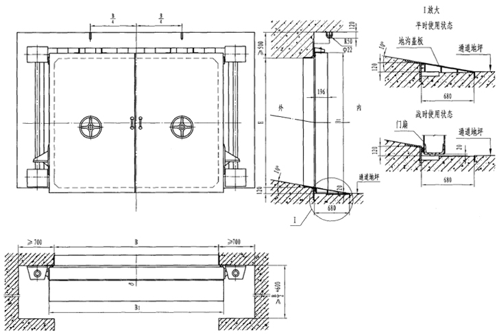 此類門適合于設(shè)置在地下人防工程出入口的坡道終端,門扇設(shè)計(jì)為反向受力,向工程內(nèi)部開(kāi)啟,平時(shí)沒(méi)有凸出地面的門檻,平戰(zhàn)轉(zhuǎn)換快捷。