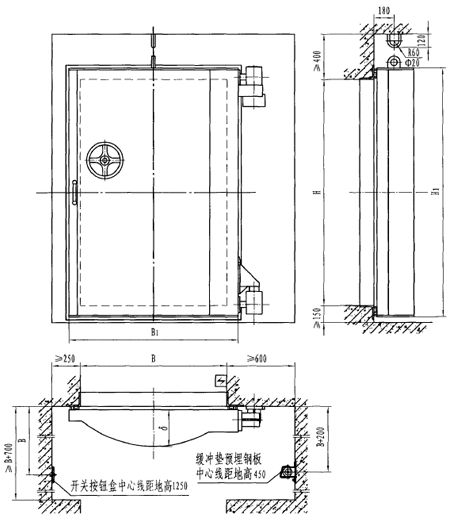 型號(hào) | 門孔寬B | 門孔高H | 門扇厚δ | B1 | H1 | 啟閉時(shí)間(s) |