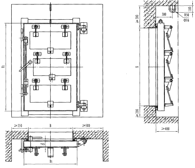 此類懸擺式活門為鋼結構,使用、維護方便,適用于進、排風口和排煙口。其中懸擺式防爆波屏蔽活門是在普通懸擺式防爆活門的基礎上增加了屏蔽功能,其防電磁脈沖能力為II級。