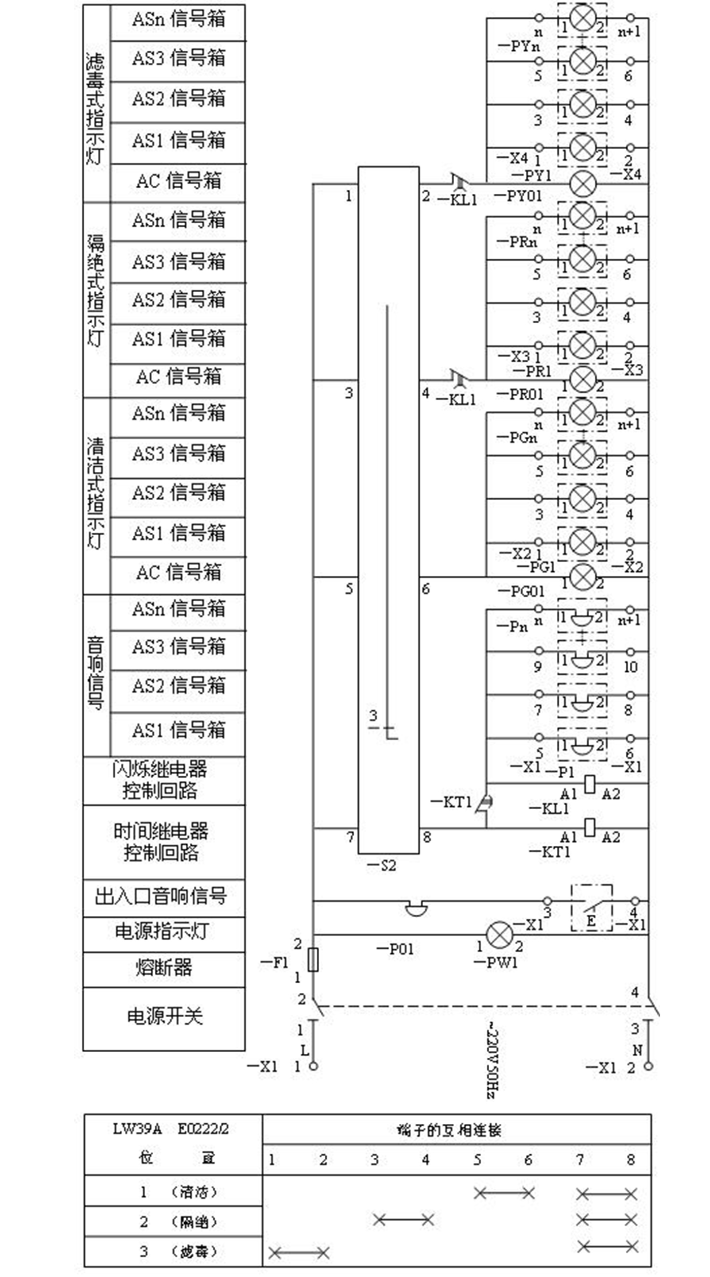 2、AS1~ASn:通風(fēng)方式信號(hào)指示燈箱,分別高在戰(zhàn)時(shí)進(jìn)風(fēng)房、排風(fēng)機(jī)房、柴油發(fā)電機(jī)房、電站控制室、人員出入口(連通口)最里一道密閉門內(nèi)側(cè)及其他需要設(shè)置的地方。數(shù)量由單項(xiàng)工程設(shè)計(jì)決定。